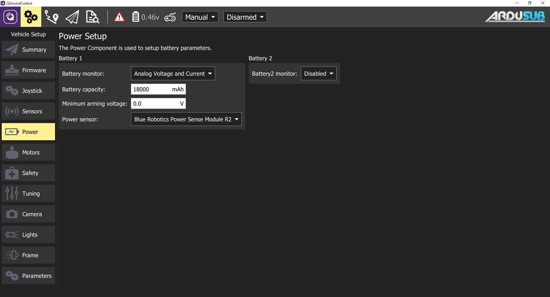In the Power tab of the QGroundControl Vehicle Setup page, select “Blue Robotics Power Sense Module R2” for the Power Sensor.