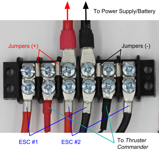 The spade connectors from the XT90 connector/power source can be connected beneath two of the jumpers (the spade connectors are too wide to fit on top); this helps to limit the distance the current to the ESCs must flow through the jumpers and barrier blocks. The Thruster Commander power cable and ESCs can then be connected along the other side of the barrier block. Note that the Thruster Commander power cable should be omitted if the Commander is being powered via a BEC (see above).