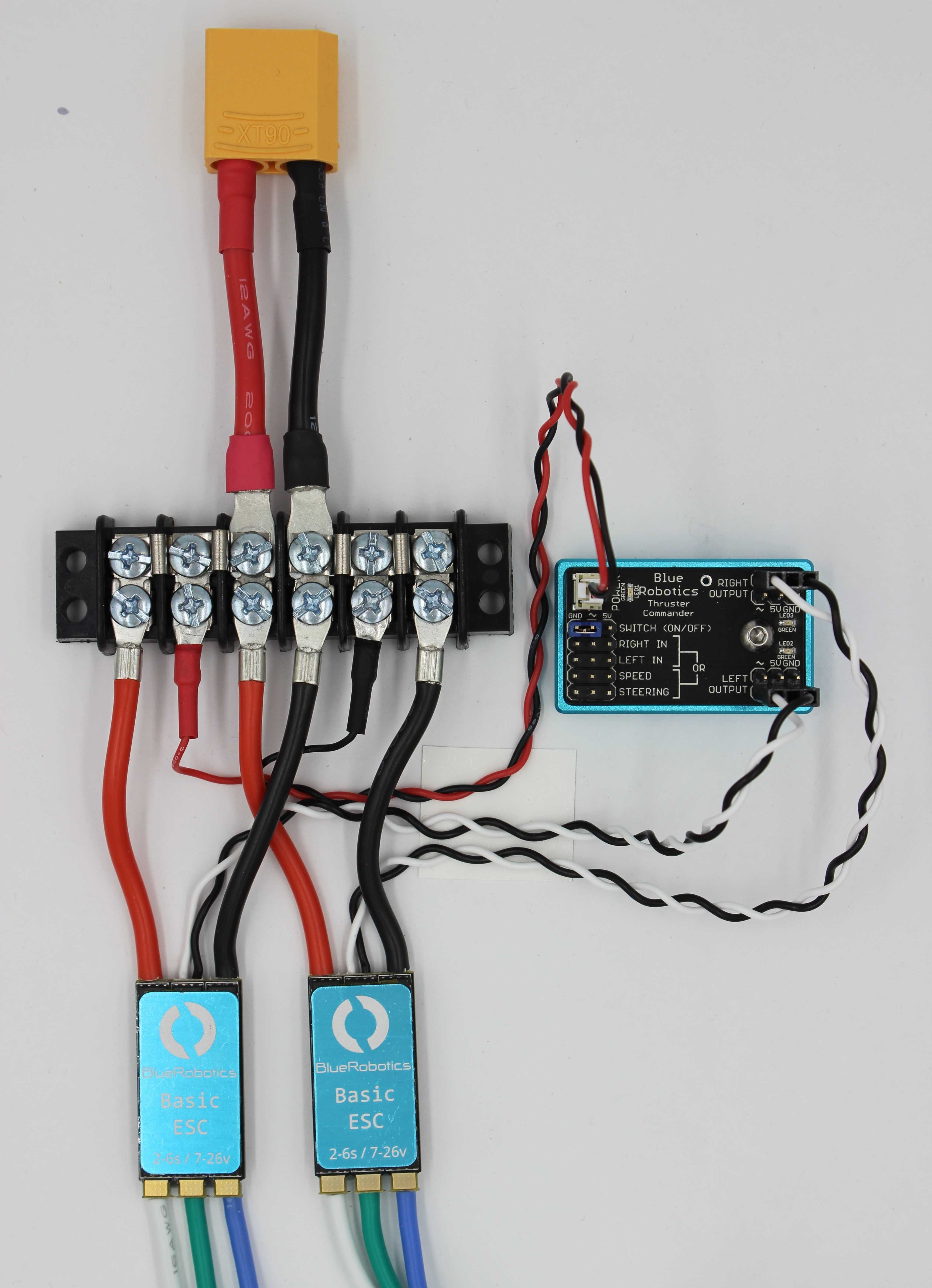 The Thruster Commander, ESCs, and batteries do not contain reverse-polarity or short-circuit protections. Double-check your wiring before applying power for the first time.