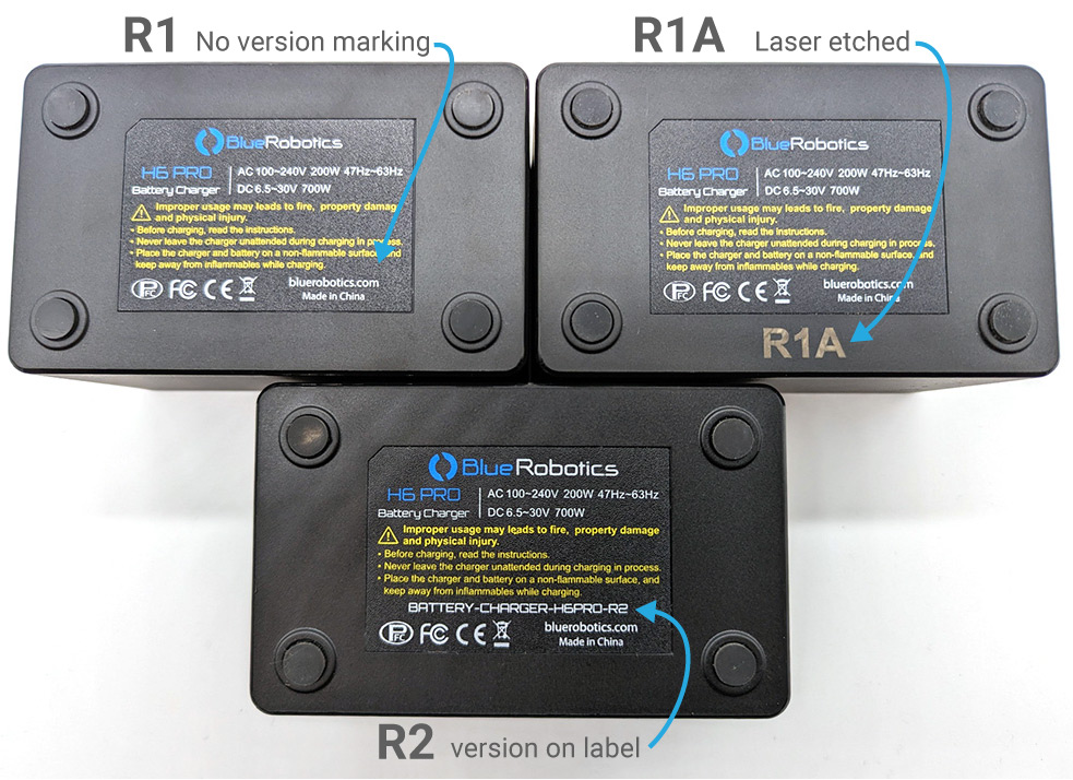 2. Download the correct firmware file for the hardware version of the charger you have. There are three hardware versions of the H6 Pro Charger: R1, R1A, and R2. You can find out the hardware version of your charger by looking at the bottom of the charger. R1 versions have no version information, R1A chargers are laser etched with “R1A” on the plastic, and R2 chargers have the version information on the label. See the picture below.