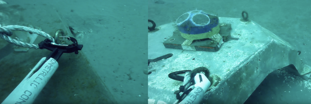 We were skeptical of whether a retrieval via cable would be successful, as the end of the wire was only tangled under the weight. We slowly lifted the weight until it was about 80 ft below the surface, at which point a diver manually secured the connection. We held our breaths as the diver surfaced and the final lift started, but within moments we realized the reattachment attempt failed and the weight was lost again.
