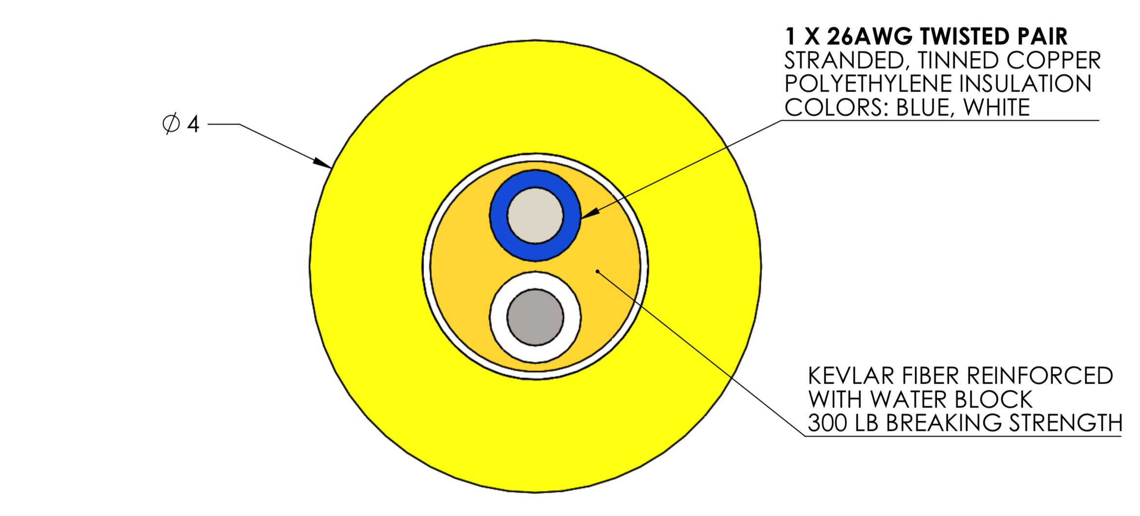 The core of the cable contains Kevlar strands for strength and Dacron fibers for space filling. Both fibers are impregnated with waterblocking compound to block any leaks caused by nicks or rips in the cable. The high-visibility yellow polyurethane foam jacket resists abrasion and provides neutral buoyancy.
