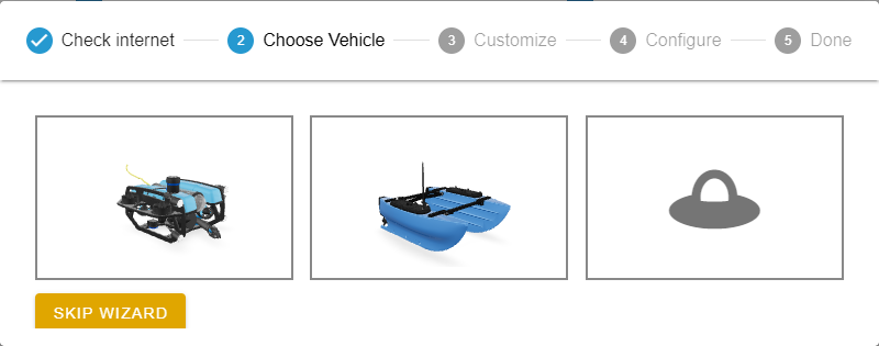 On the first boot, BlueOS will guide you through a vehicle configuration wizard to set up the configuration for your vehicle. Choose the BlueROV2 option to configure BlueOS for a BlueROV2 or BlueROV2 Heavy. Choose the BlueBoat option to configure BlueOS for BlueBoat.