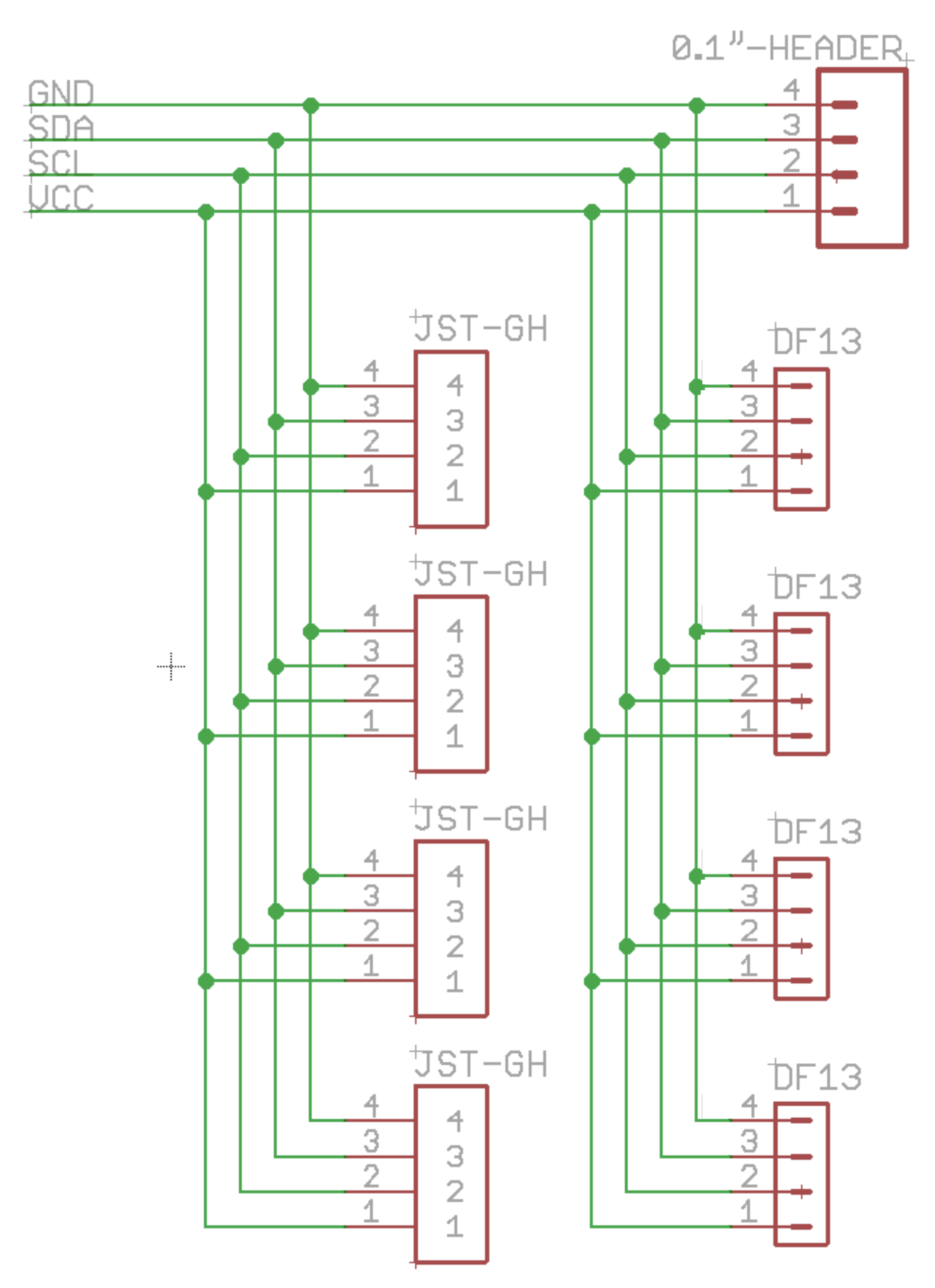 The bus splitter has several different types of connectors to allow for forwards and backwards compatibility with various sensors and autopilots. There are four DF-13 connectors, four JST-GH connectors, and through-holes for one 0.1″ header connector.