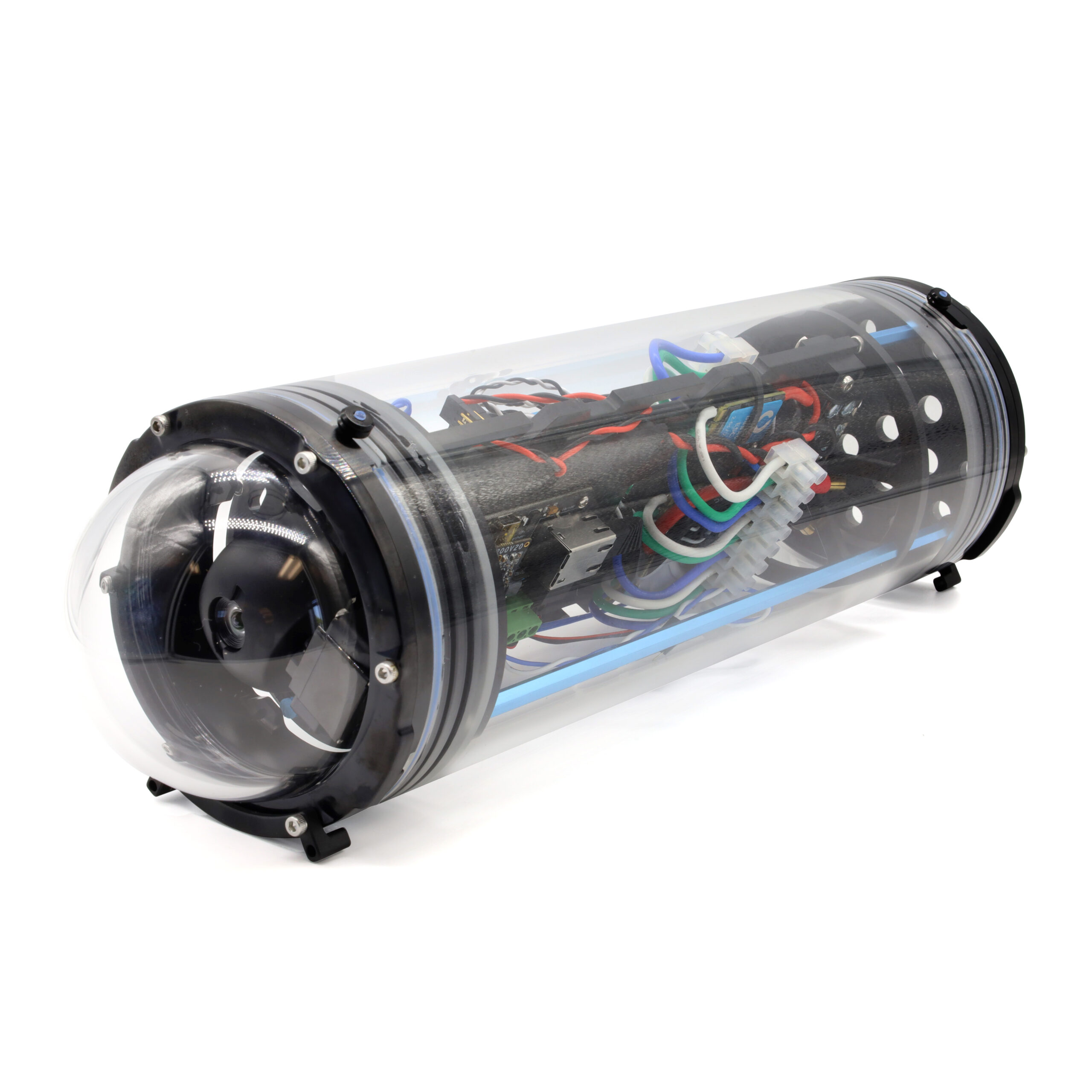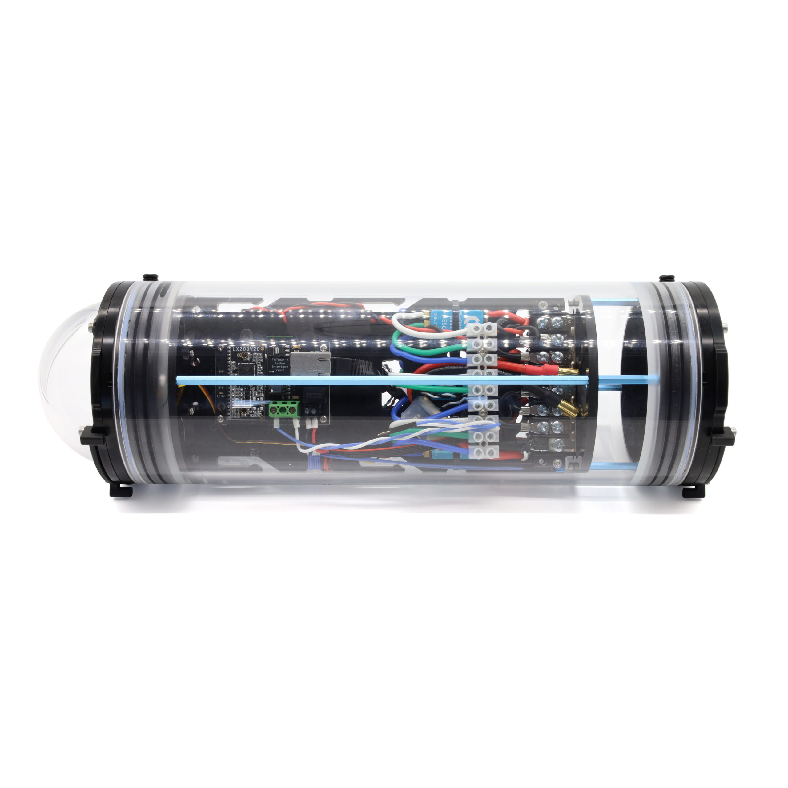 Pre-assembled and tested with the BlueROV2 electronics, this enclosure is ready-to-integrate into your custom ROV frame or other application. It includes the 18-hole end cap with nothing installed. At minimum, we recommend including a Pressure Relief Valve, a pressure sensor like the Bar30 Pressure/Depth Sensor and the Power Cable Set to connect to a battery enclosure.