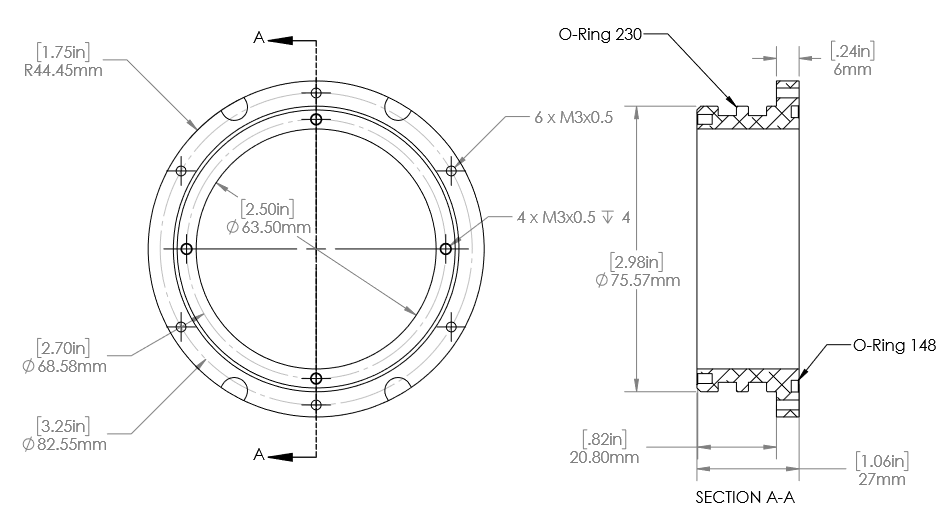 This flange has an O-ring seal that fits in the tube of the original Water Tight Enclosure for ROV/AUV (3″ Series). The modular design allows a variety of end-caps to be attached to the flange.