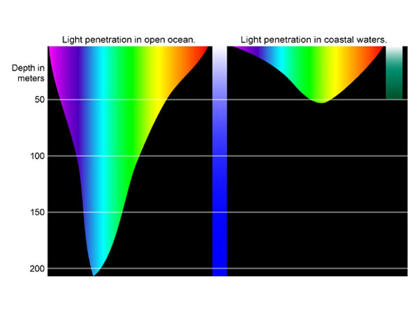 Lighting conditions underwater are quite different than above water. The light that penetrates the surface is absorbed at different rates depending on the color. Here’s a neat plot from NOAA Ocean Explorer showing how far different colors penetrate the water. As you can see, blue and green tend to go the furthest whereas red is absorbed almost immediately.